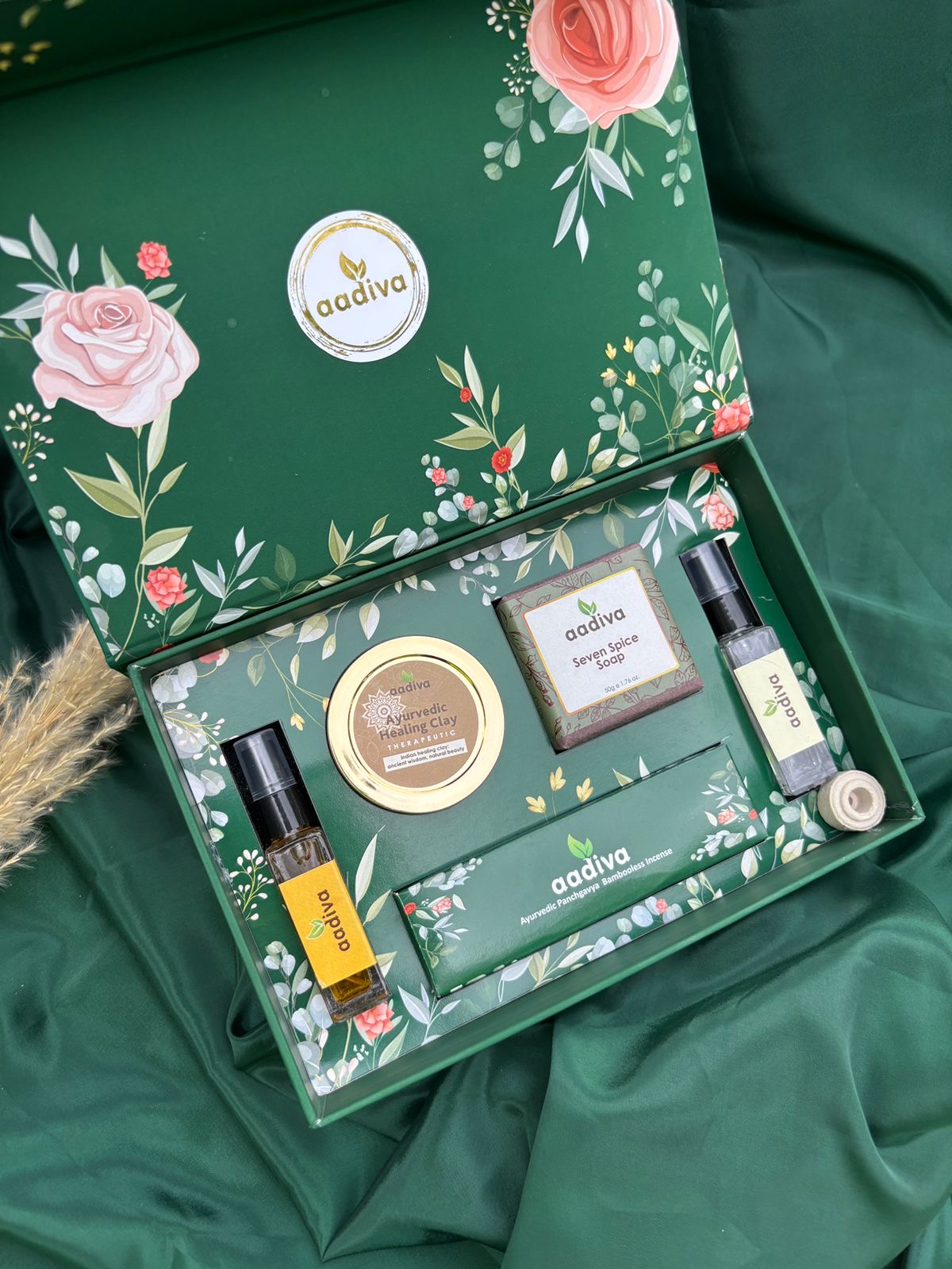 Green Mini Festive Box – A compact, eco-friendly gift set focused on wellness, purity, and aromatic indulgence. Includes Mini Sandalwood Saffron and Natural Camphor room sprays, Ayurvedic Healing Clay, Mini Seven Spice Soap, and a Mini Incense Sticks Box for a holistic gifting experience.