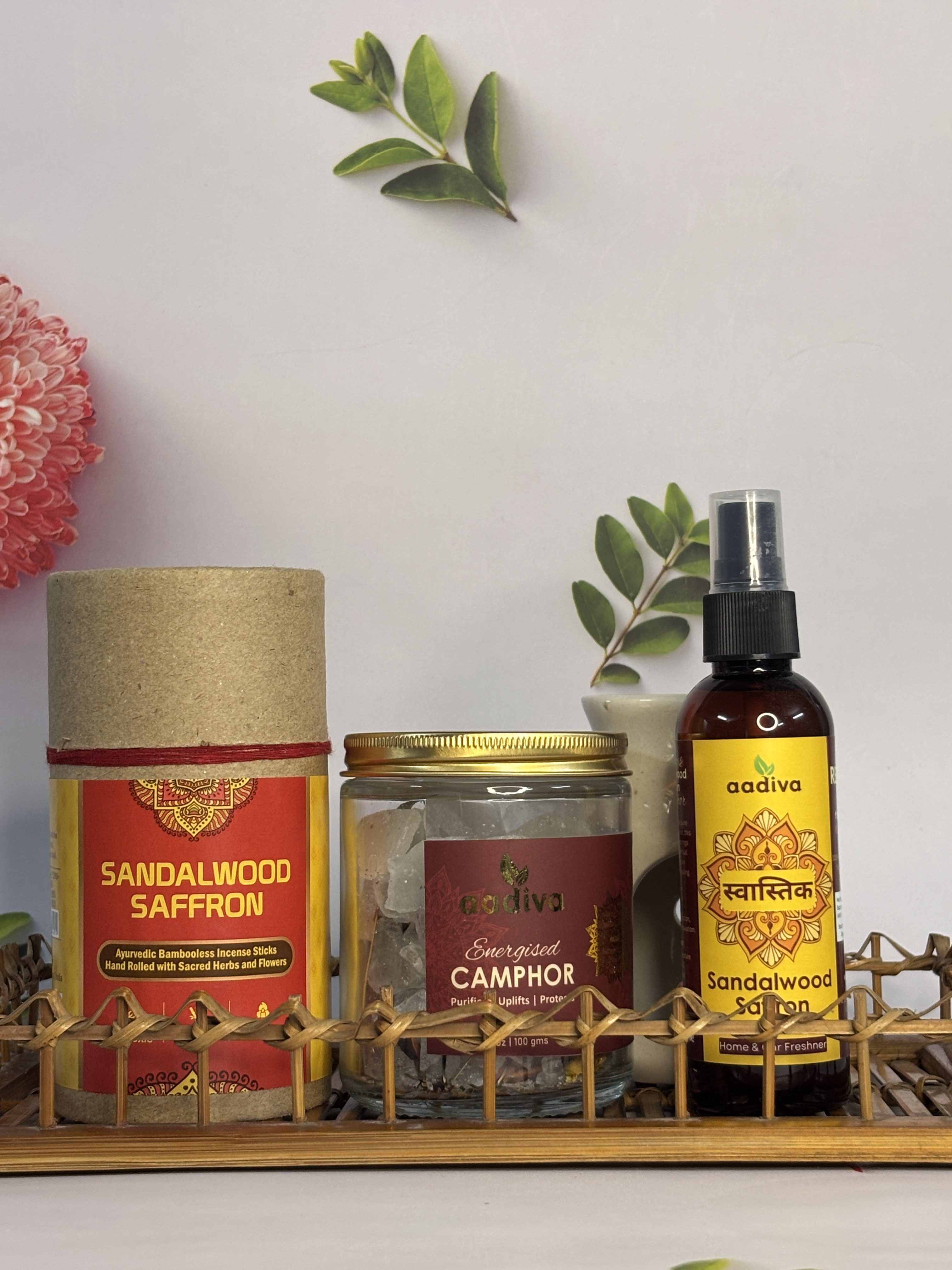 Aadiva Pooja Gift Combo – A 3-in-1 set of incense sticks, camphor air freshener, and energised camphor. Perfect for daily pooja, meditation, and gifting.