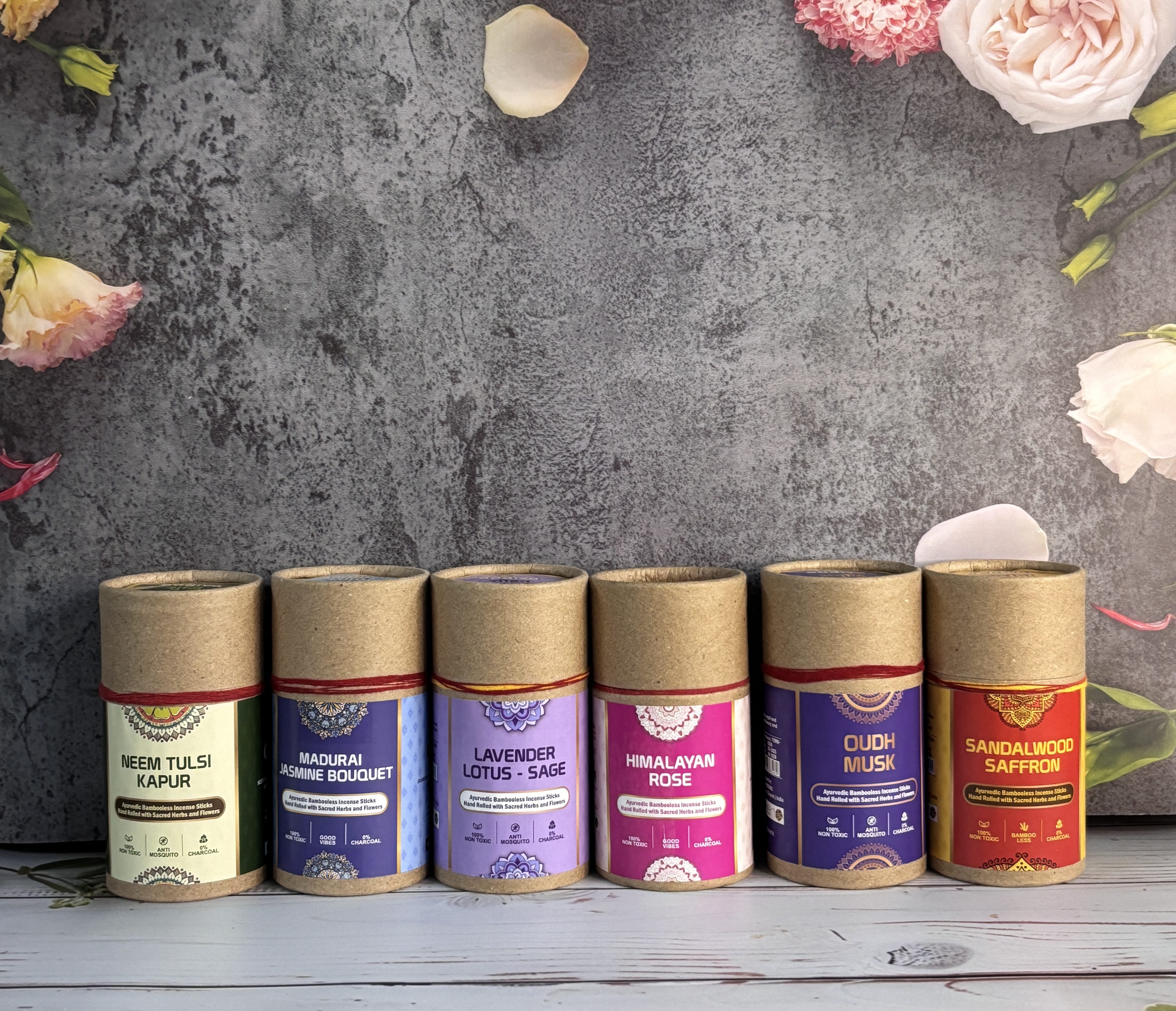 The Sacred Six Combo – A premium gift set of six bamboo-free, charcoal-free Ayurvedic incense sticks featuring Sandalwood Saffron, Madurai Jasmine, Lavender Lotus Sage, Himalayan Rose, Oudh Musk, and Neem Tulsi Kapur. Perfect for gifting and creating a serene, fragrant home.